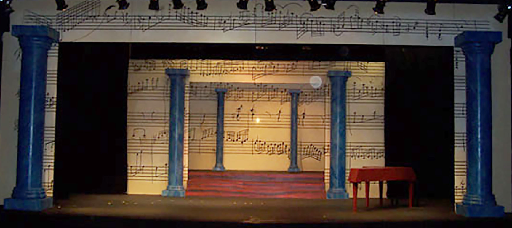 The set features a giant reproduction of a manuscript page in Mozart’s hand of the “Sonata for Violin and Piano in G Major,” flanked by blue marble columns. The piano is a reproduction of Mozart’s own pianoforte, fitted with a working keyboard that could be played live as well as playing recorded music sent from the sound booth, including pieces recorded by Noel Howland.