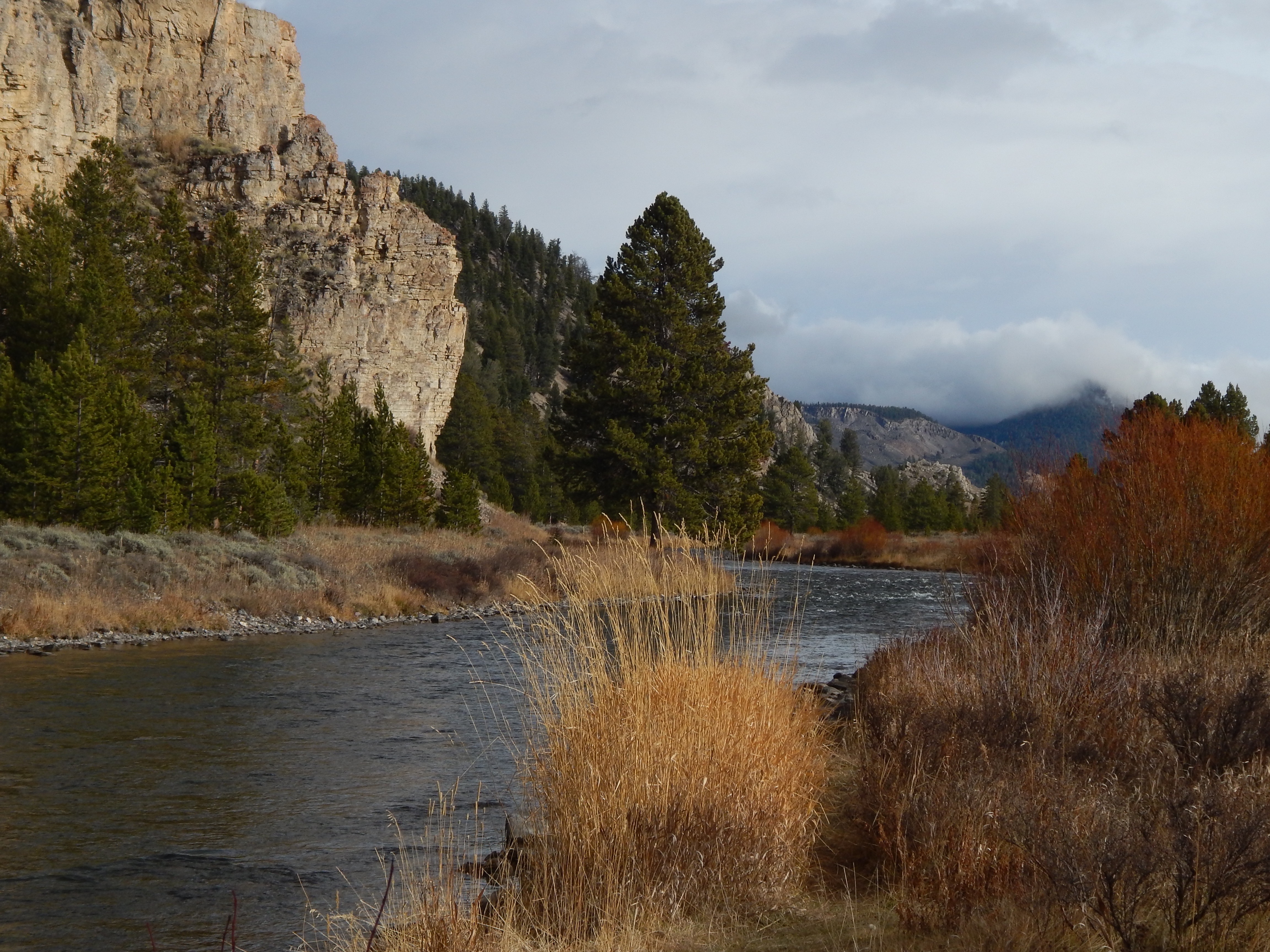 The next day we head north, entering West Yellowstone in such a thick fog that the town is invisible until the last moment. Someone threw a switch, and a town appears. It’s time for a road drink. In this case, a Good Medicine red ale at the Slippery Otter. And then we are off, climbing 191 as it flirts with the border of Yellowstone Park then chases the Gallatin River back to the interstate.