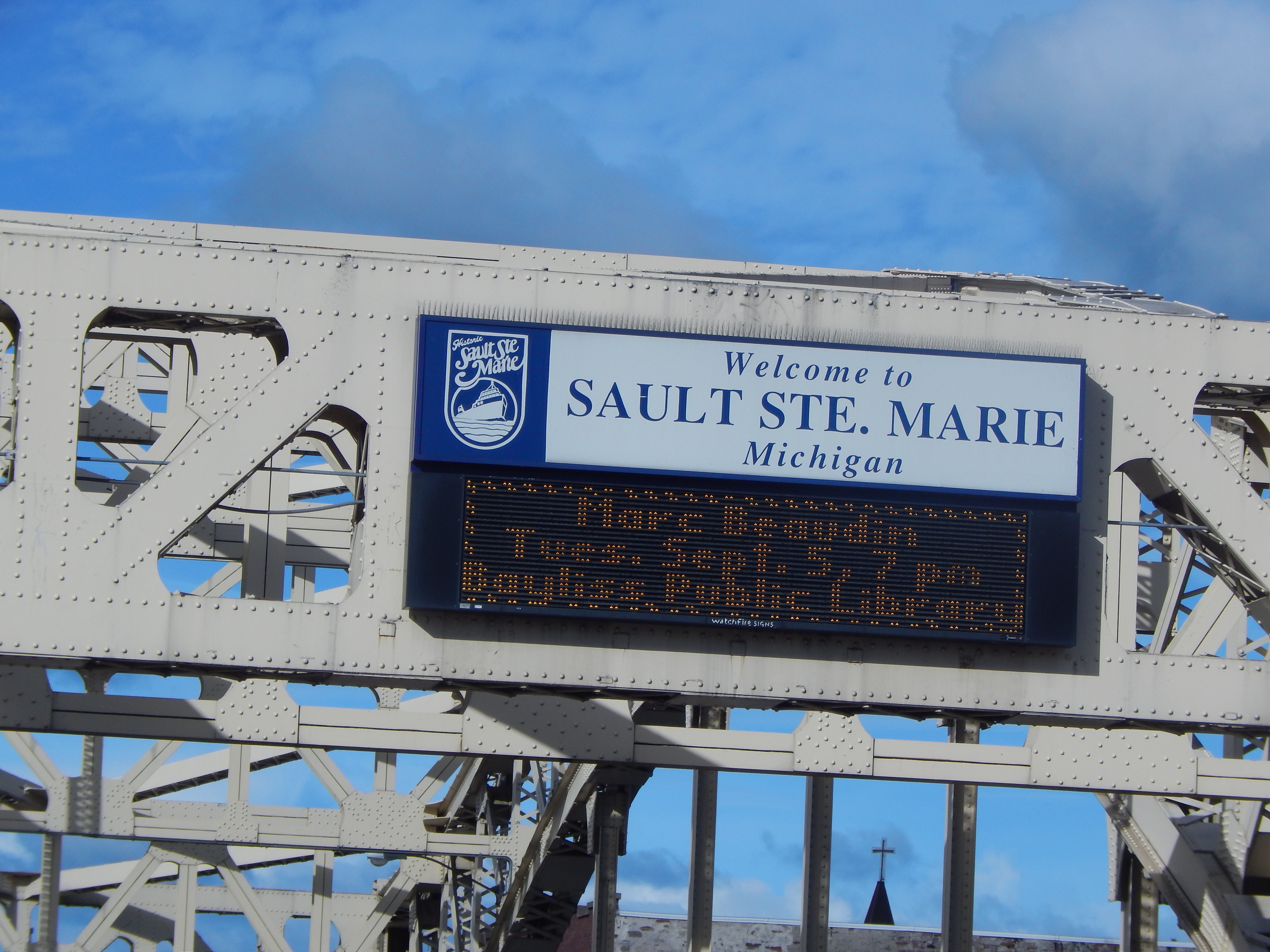 Driving into the Soo, I almost crashed when I saw my name flashing on a big sign above the bridge entering downtown. I’m used to my name in plastic or chalk at bars and coffeehouses, but damn, my name in lights at the entrance to a city. That’s what I call a welcome. Thanks SSM!
